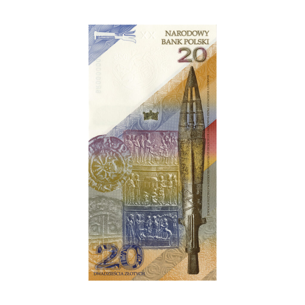 The back of the note (vertical arrangement) in the top right corner, the inscription: NARODOWY / BANK POLSKI; below it, the number: 20. Centrally, a fragment of the Gniezno Doors with scenes depicting: the purchase of St. Adalbert’s body from the Prussians by Boleslaus the Brave, the transfer of St. Adalbert’s body, and the burial of St. Adalbert’s remains in Gniezno; above it, a crown-shaped window cut into the paper. To the right, a replica of the head of the Lance of Saint Maurice and, along the edge, vertically, the clause: BANKNOTY EMITOWANE PRZEZ NARODOWY BANK POLSKI SĄ PRAWNYM ŚRODKIEM PŁATNICZYM W POLSCE (Banknotes issued by Narodowy Bank Polski are legal tender in Poland), composed of letters at a 90° angle. On the left, a fragment of the obverse and reverse of the Princes Polonie coin. In the bottom left corner, the number: 20; below it, the inscription: DWADZIEŚCIA ZŁOTYCH (twenty złoty).