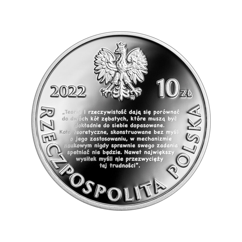 u góry wizerunek orła ustalony dla godła Rzeczypospolitej Polskiej, pod orłem, po prawej stronie, znak mennicy: m / w. Z lewej strony orła oznaczenie roku emisji: 2022, z prawej strony orła napis: 10 ZŁ. Poniżej orła cytat z dzieła Jana Stanisława Lewińskiego „Zasady ekonomii politycznej” o treści: „Teoria i rzeczywistość dają się porównać / do dwóch kół zębatych, które muszą być / dokładnie do siebie dopasowane. / Koło teoretyczne, skonstruowane bez myśli / o jego zastosowaniu, w mechanizmie / naukowym nigdy sprawnie swego zadania / spełniać nie będzie. Nawet największy / wysiłek myśli nie przezwycięży / tej trudności”, zakończony kropką. Wzdłuż dolnego brzegu półkolem napis: RZECZPOSPOLITA POLSKA.